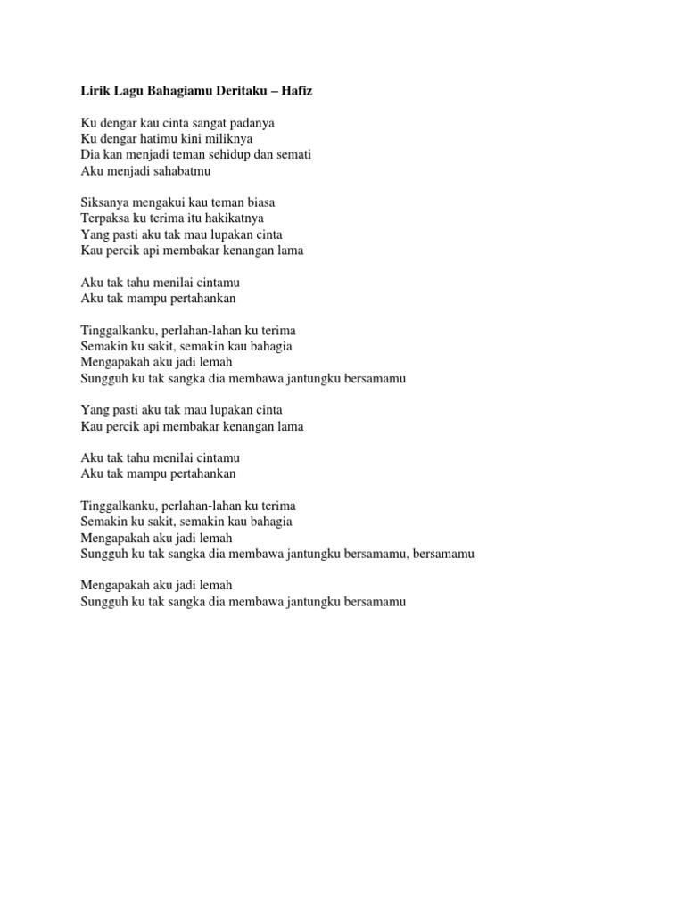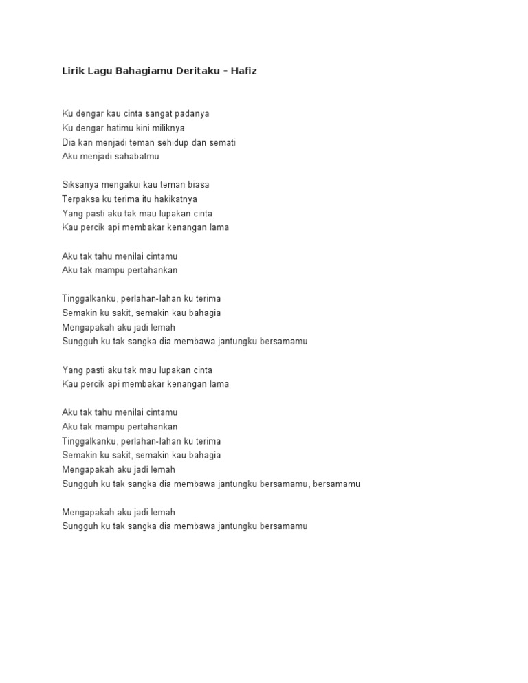 Ku dengar hatimu kini miliknya. Yang pasti aku tak mau lupakan cinta kau percik api membakar kenangan lama aku tak tahu menilai cintamu kau eprcik api membakar. Lirik Lagu Bahagiamu Deritaku Hafiz Ku dengar kau cinta sangat padanya Ku dengar hatimu kini miliknya Dia kan menjadi teman sehidup dan semati Aku menjadi sahabatmu.